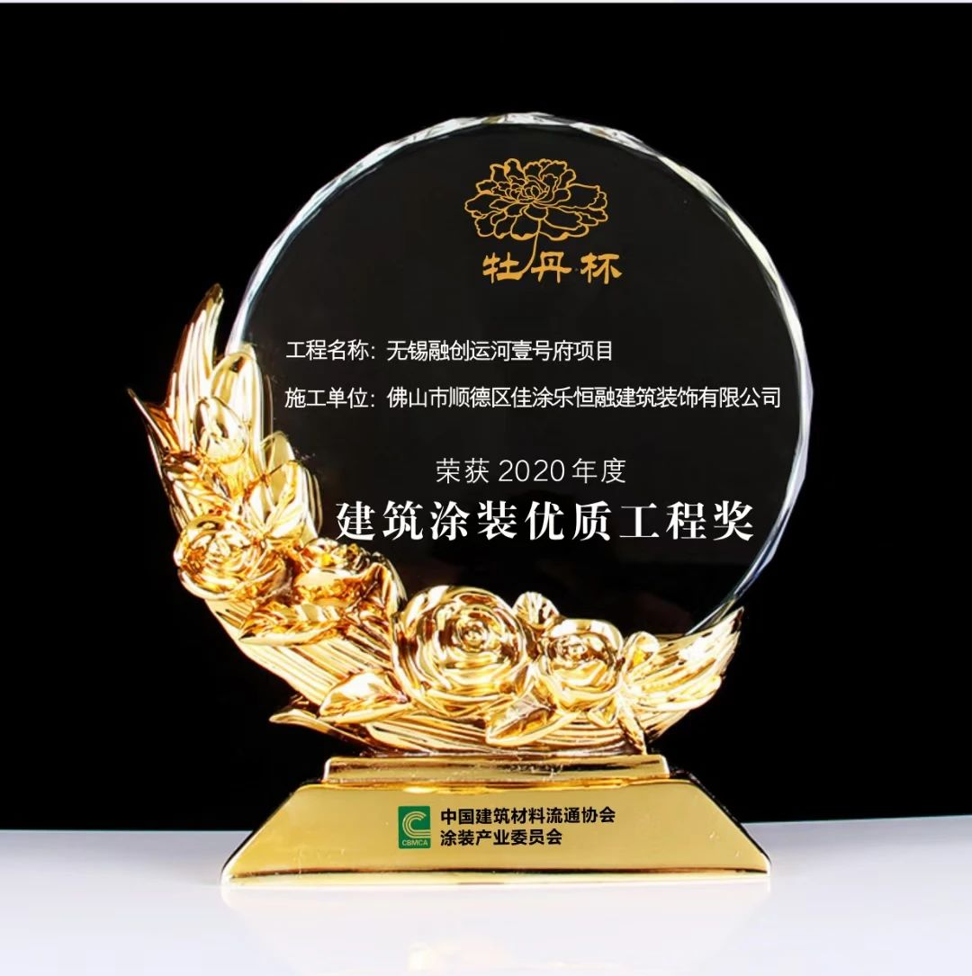 华东区域的“无锡融创运河壹号府二期”项目在2020年度建筑涂装优质工程评选中脱颖而出,斩获“牡丹杯”殊荣。这是暨“常州玉兰广场”项目后,佳涂乐第二年获得该奖项。